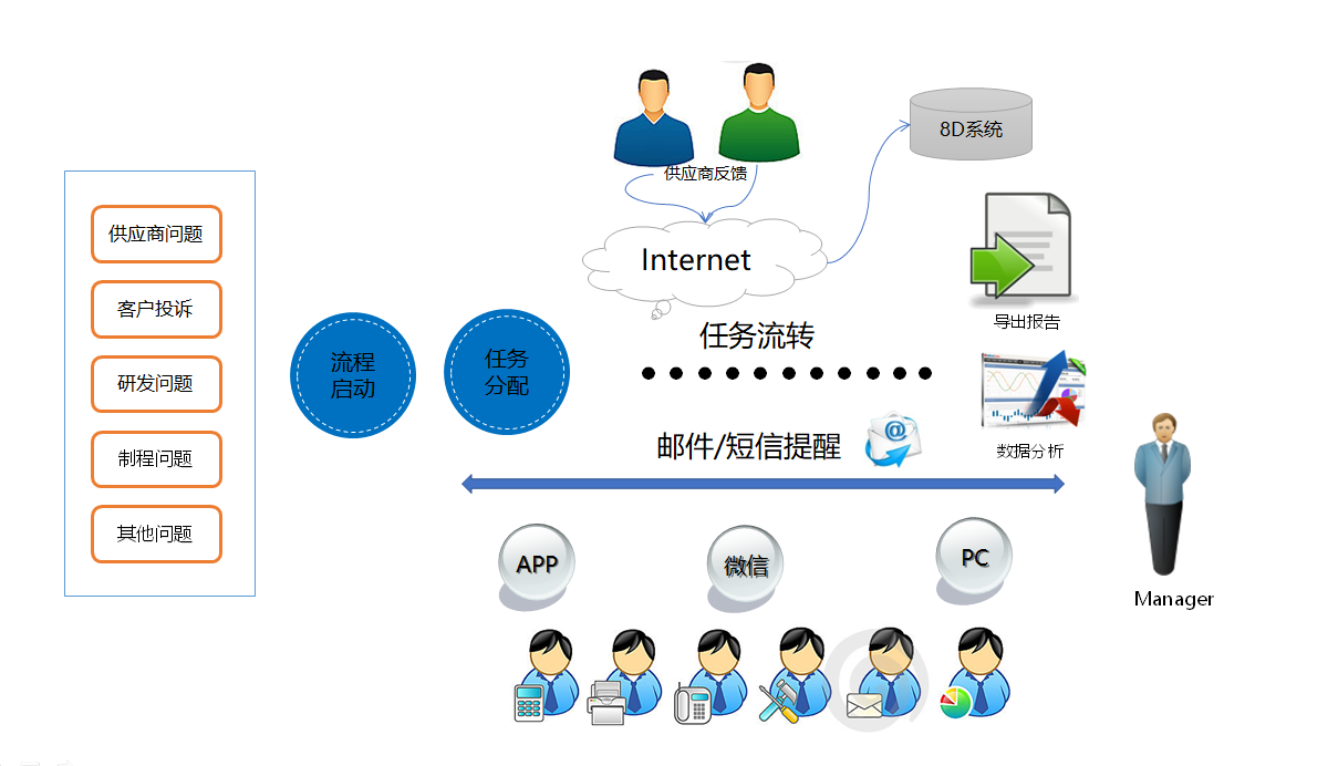 客户、供应商门户提交相关信息 支持移动端质量改进流程的处理、审批,预警信息通知、邮件触发等