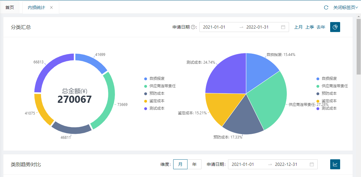 •质量成本可以按项目、产品等维度进行分布分析。也可以根据日期进行趋势分析;